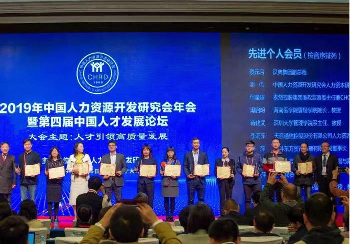20191025日,??谔锔H肆Y源有限公司及海南漢斯邁企業管理咨詢有限公司董事長兼總經理陳海平獲邀參加2019年中國人力資源開發研究會年會暨第四屆中國人才發展論壇。會上增補部分優秀人力資源從業者擔任理事和常務理事,同時表彰先進分支機構、先進會員單位和先進個人會員。陳海平先生榮獲先進個人會員表彰。
