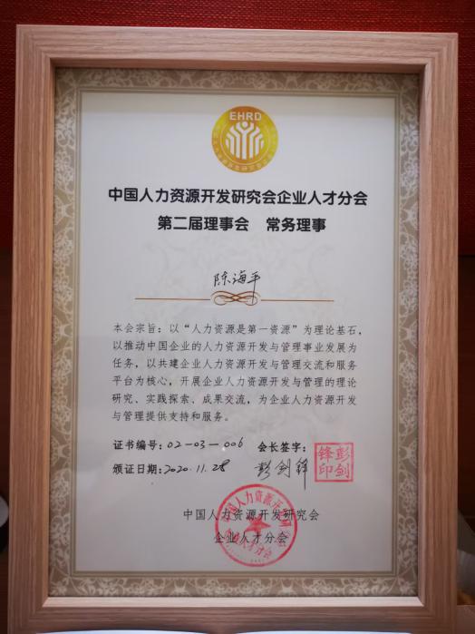 田福人力集團(tuán)創(chuàng)始人兼CEO陳海平先生,當(dāng)選中國人力資源開發(fā)研究會企業(yè)人才分會第二屆理事會常務(wù)理事