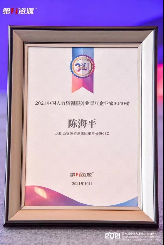 大會同期進行了“中國人力資源服務業(yè)青年企業(yè)家3040榜”頒獎典禮。中國人力資源服務業(yè)青年企業(yè)家3040榜從從業(yè)年限、卓越成就等多方面綜合考量,甄選出了30歲以下與40歲以下的青年企業(yè)家,旨在鼓勵在人力資源服務業(yè)中做出積極貢獻的青年才俊,以榜樣的力量帶領中國人力資源服務業(yè)快速前行。田福人力&漢斯邁創(chuàng)始人陳海平榮登榜單,獲得獎項。